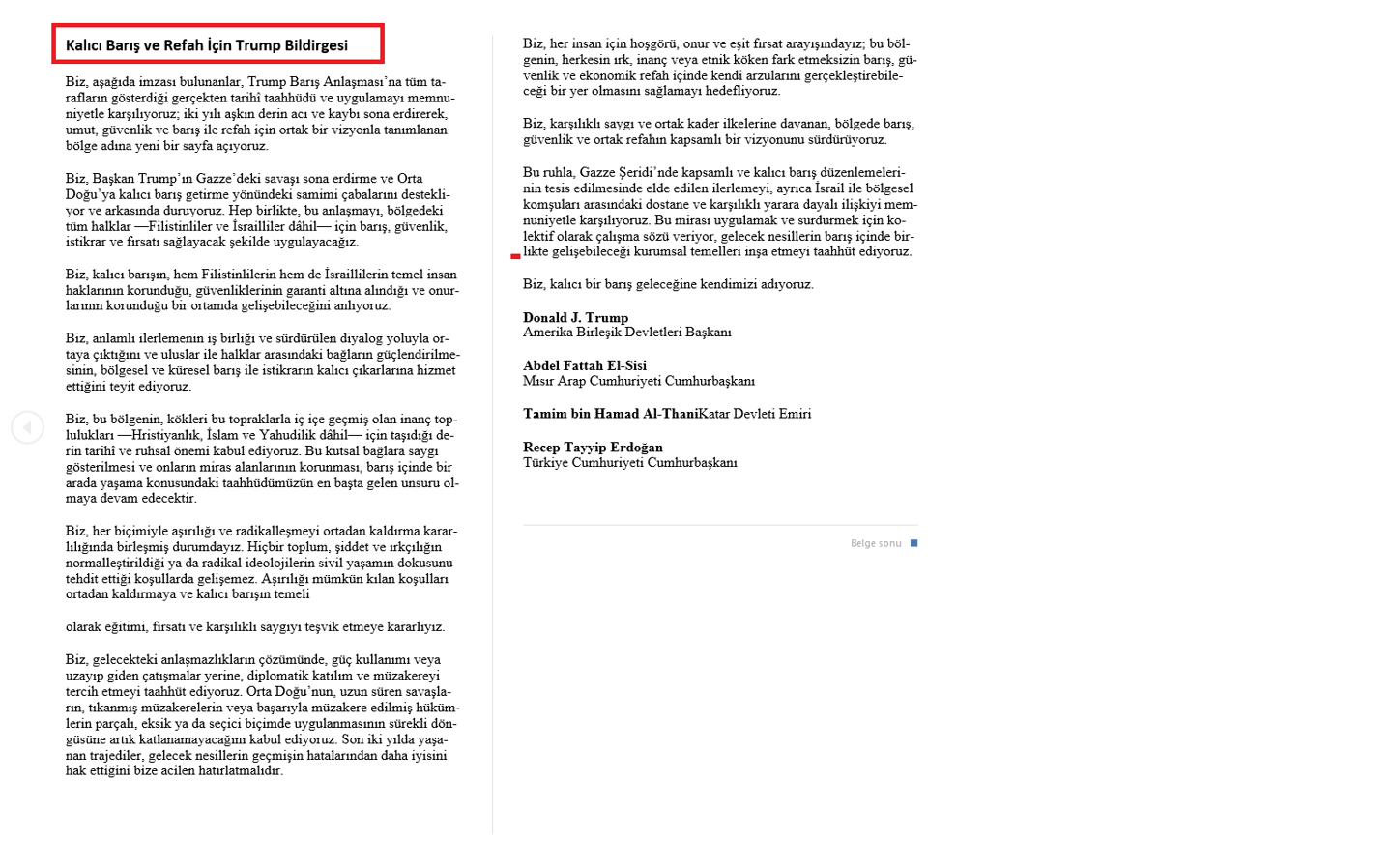 Kaynaklar: 1-https://x.com/WhiteHouse/status/1972736025597219278 2-https://www.whitehouse.gov/presidential-actions/2025/10/the-trump-declaration-for-enduring-peace-and-prosperity/?utm_source=chatgpt.com